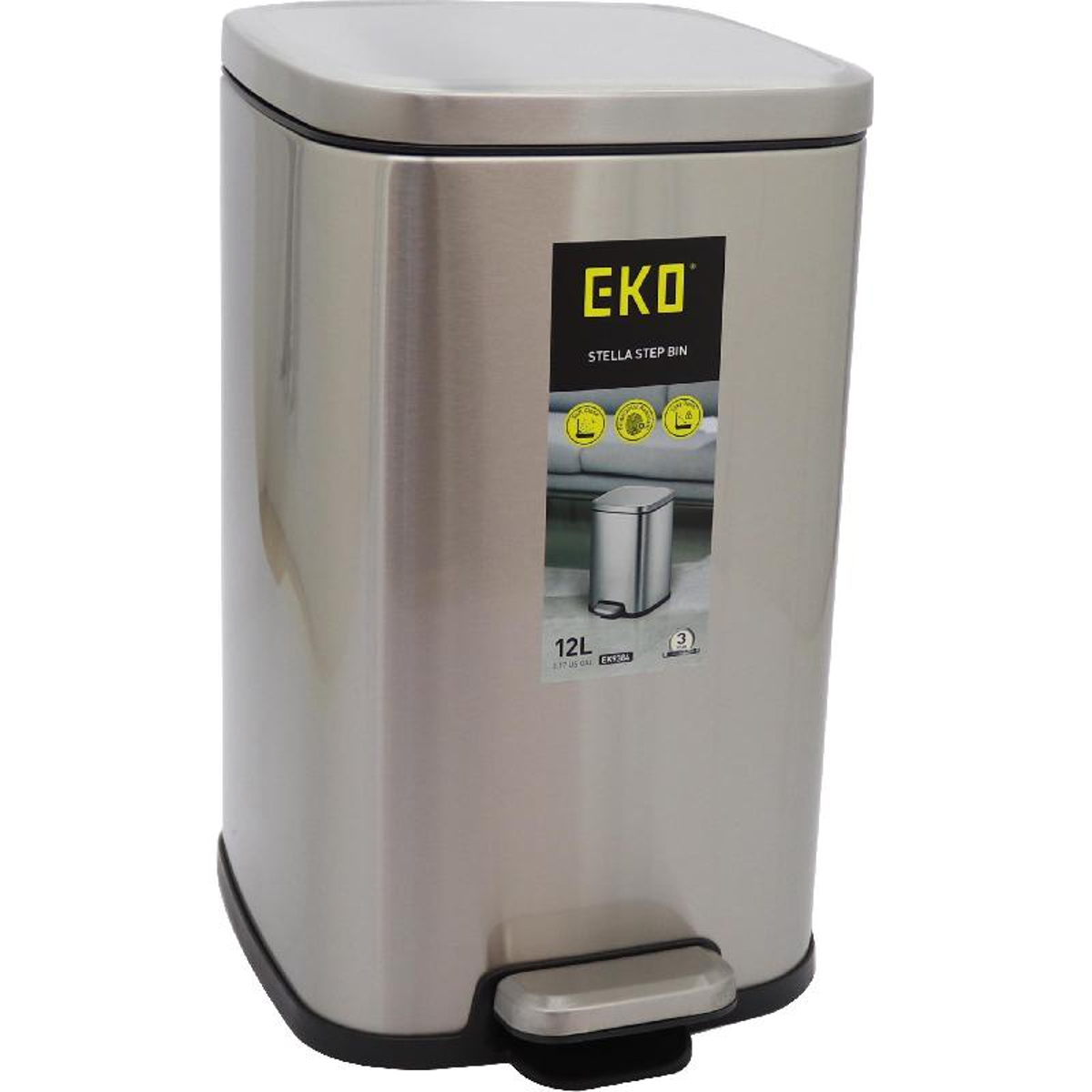 ايكو ستيلا سلة مهملات مع غطاء يرفع بالقدم، 12.00 لتر، ستاينلس ستيل/بلاستيك، فضي