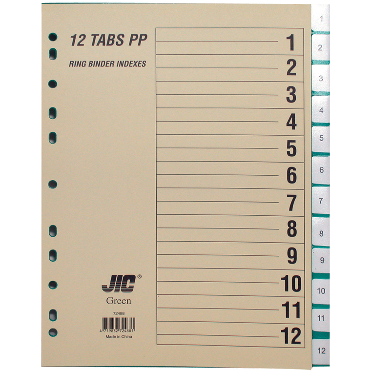 INDEX DIVIDER A4, 1-12 DIVIDER, COLOR GRN/CLR/WHT / SET