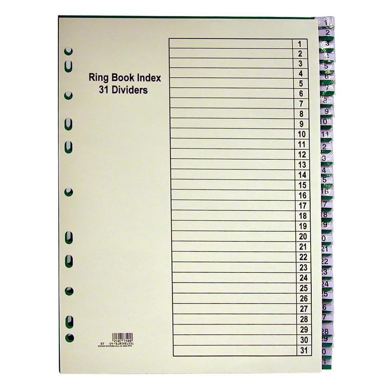 INDEX DIVIDER A4, 1-31 DIVIDER, COLOR GRN/CLR/WHT / SET