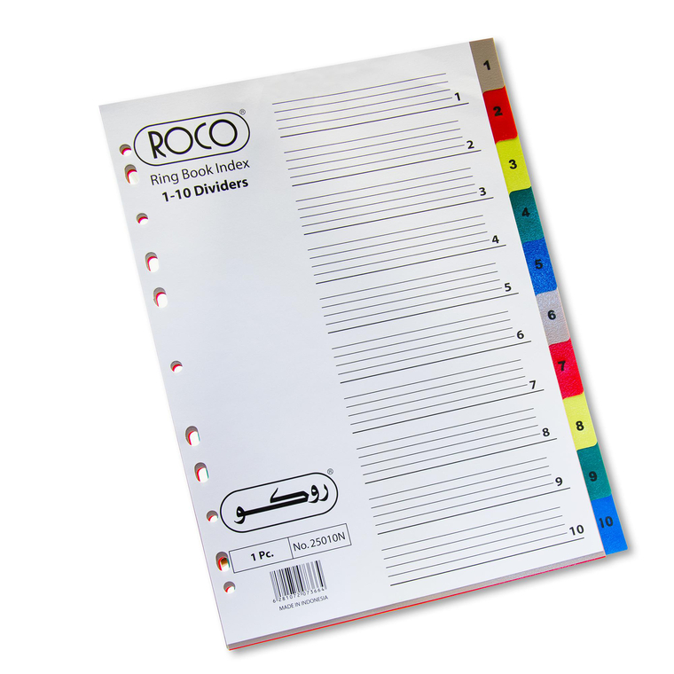 روكو Index Divider، A4، 10/علامات تبويب 1، علامة التبويب مرقمة، الوان متنوعة، PP بلاستيك