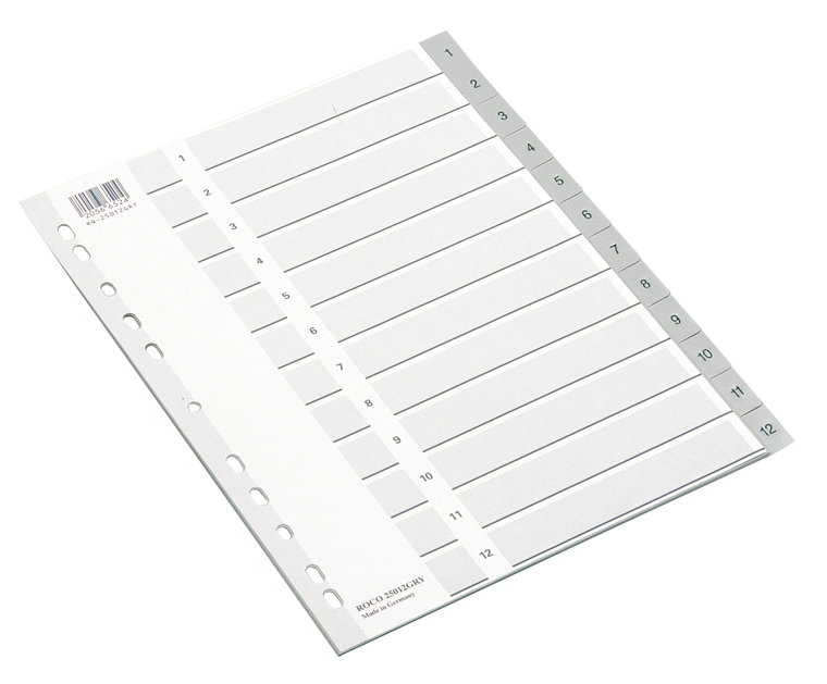 روكو Index Divider، A4، 12/علامات تبويب 1، علامة التبويب مرقمة، لون رمادي، بلاستيك