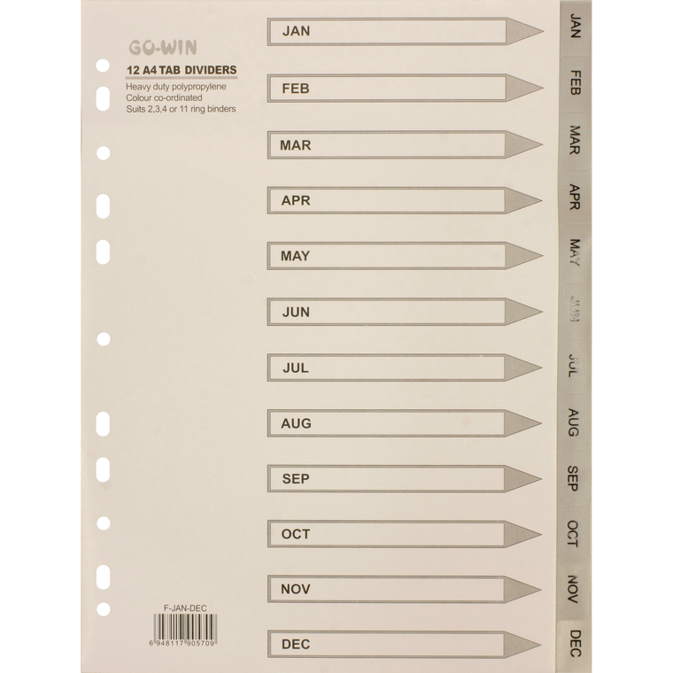 Index Divider، A4، 12/علامات تبويب 1، ديسمبر - علامة التبويب يناير، PP بلاستيك